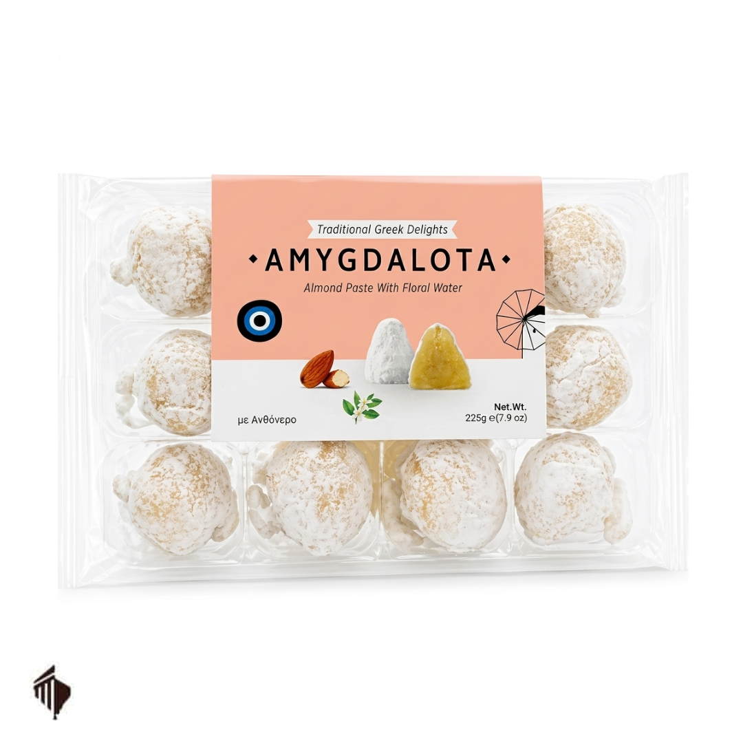 Τα αμυγδαλωτά είναι τοποθετημένα σε διάφανα PP καφασάκια με θήκες, αεροστεγώς συσκευασμένα για την καλύτερη διατήρησή τους.