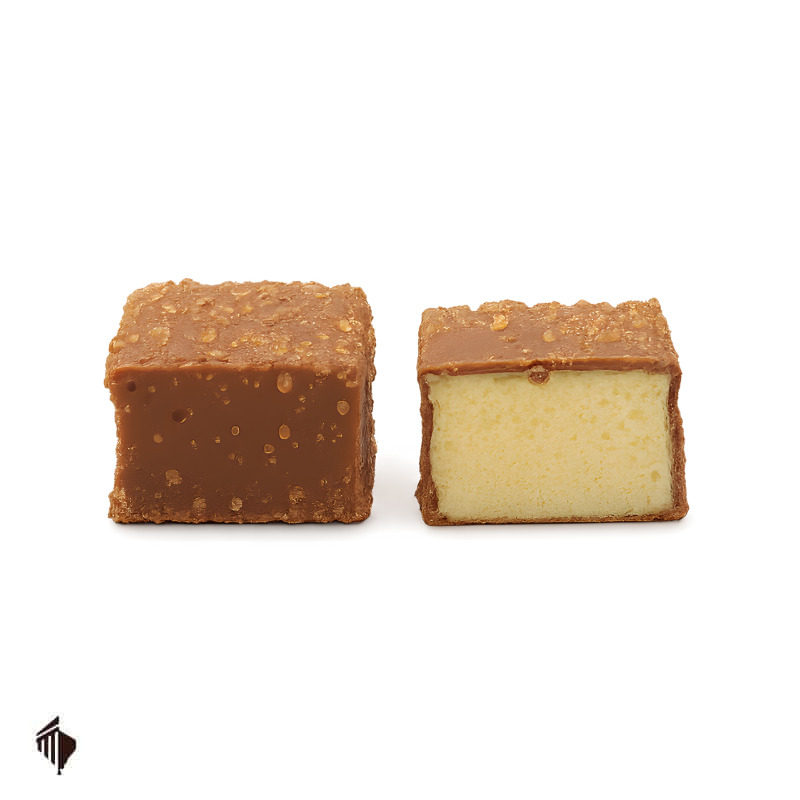 Η επικάλυψη σοκολάτας γάλακτος αγκαλιάζει κάθε κύβο, ενώ η κρυσταλλική ζάχαρη προσθέτει διακριτική λάμψη και απαλή τραγανότητα.