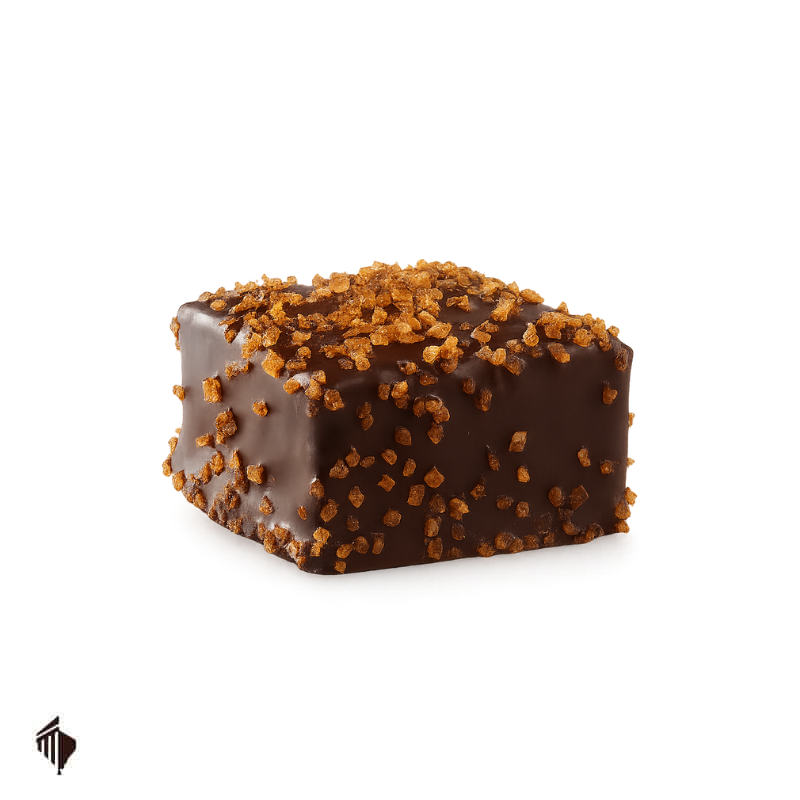 Η επικάλυψη dark chocolate χαρίζει έντονη σοκολατένια αίσθηση, ενώ η πορτοκαλί κρυσταλλική ζάχαρη στην κορυφή προσθέτει φωτεινότητα και λεπτή τραγανότητα.