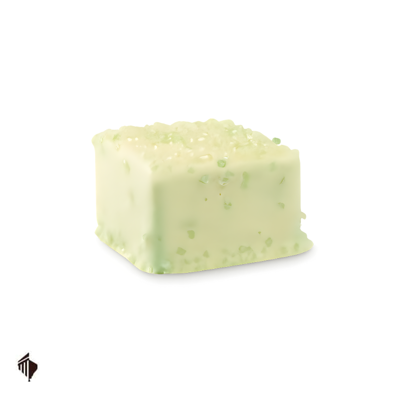 Χειροποίητο βελγικό σοκολατάκι σε σχήμα κύβου, με αφράτη και βελούδινη γέμιση με γεύση Φιστίκι, επικάλυψη Λευκής σοκολάτας και διακόσμηση πράσσινης κρυσταλλικής ζάχαρης .