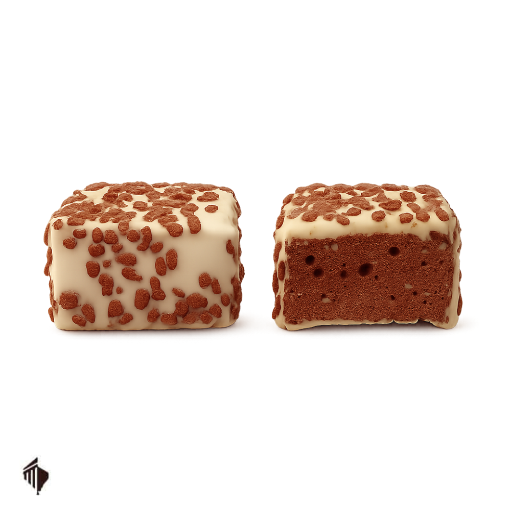Κάθε κύβος είναι προσεκτικά φτιαγμένος με επικάλυψη Λευκής σοκολάτας και αφράτη γέμιση ​με γεύση πραλίνας φουντουκιού​. Η σκαλιέ​τα σοκολάτας γάλακτος σαν διακόσμηση δίνει μια ιδιαίτερη οπτική πινελιά και αναδεικνύει το γαστρονομικό του χαρακτήρα​.