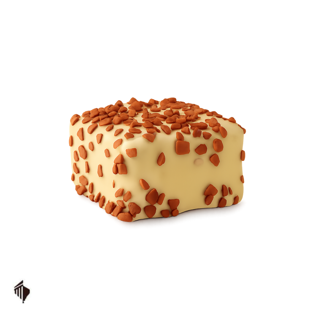 Χειροποίητο Βελγικό σοκολατάκι σε σχήμα κύβου, με αφράτη και βελούδινη γέμιση με γεύση πραλίνας φουντουκιού, επικάλυψη Λευκής σοκολάτας και διακόσμηση σκαλιέτας γάλακτος.